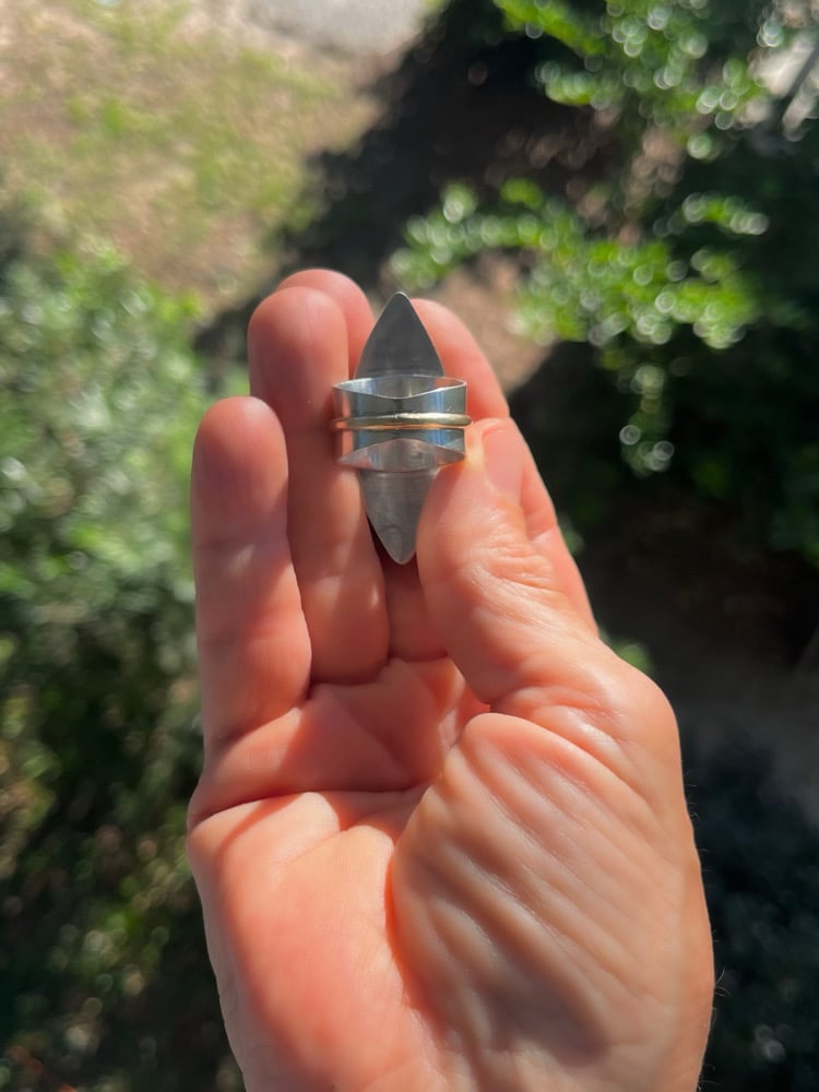 This ring fits a size 9-9.5 and has a decorative sterling and brass band.