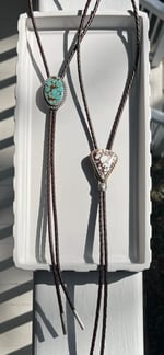 Two beautiful bolo’s, one in traditional bright Turquoise and one Wild Horse Turquoise. Both completely handcrafted and strung with a rich braided leather and hand forged, sterling bolo tips.