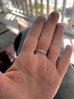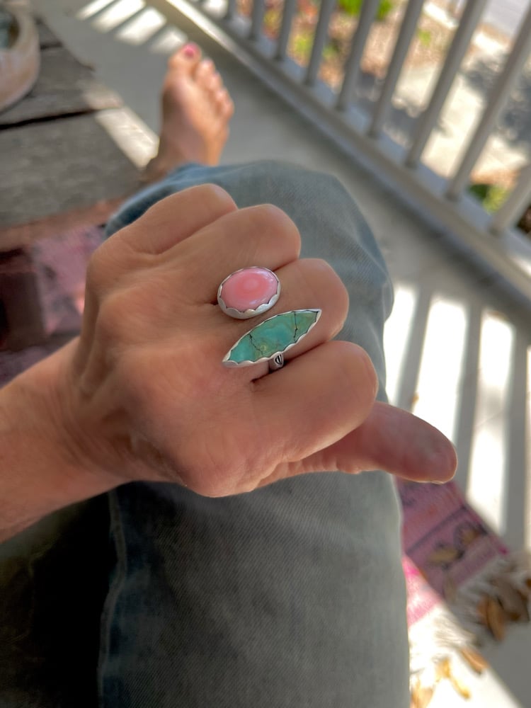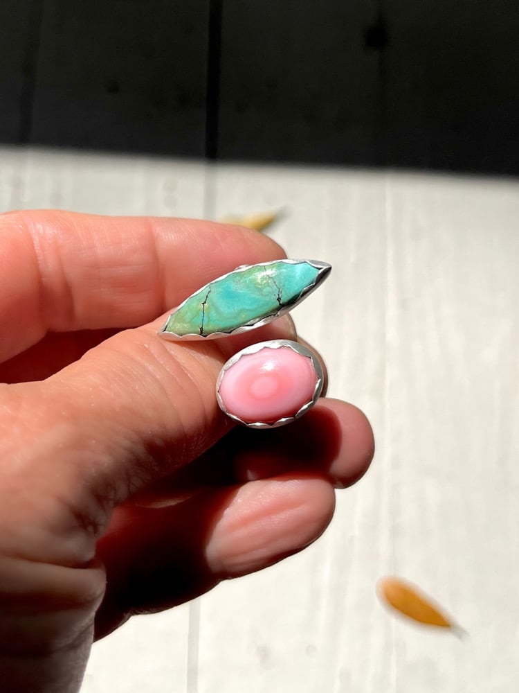 An earthy turquoise is paired with a bright conch shell, in sterling bezels and a hand stamped band. Backplates are Nu Gold.