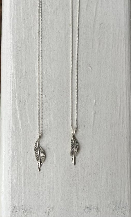 A pretty, little, handcrafted sterling feather, is strung on a sterling chain.