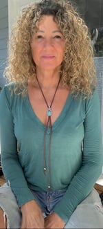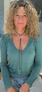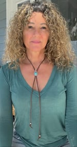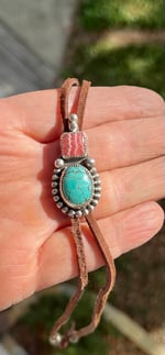 This Bolace (half necklace, half bolo:) can be worn at any length. The rich stones are complemented by the rich suede that it slides on.