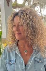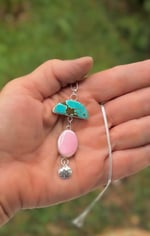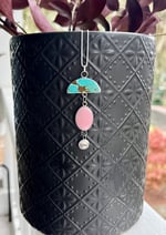 Bright turquoise is complimented by the most beautiful shade of pink shell, finished off with a little stamped lotus. Completely handmade of sterling silver and strung on a 17” sterling chain.